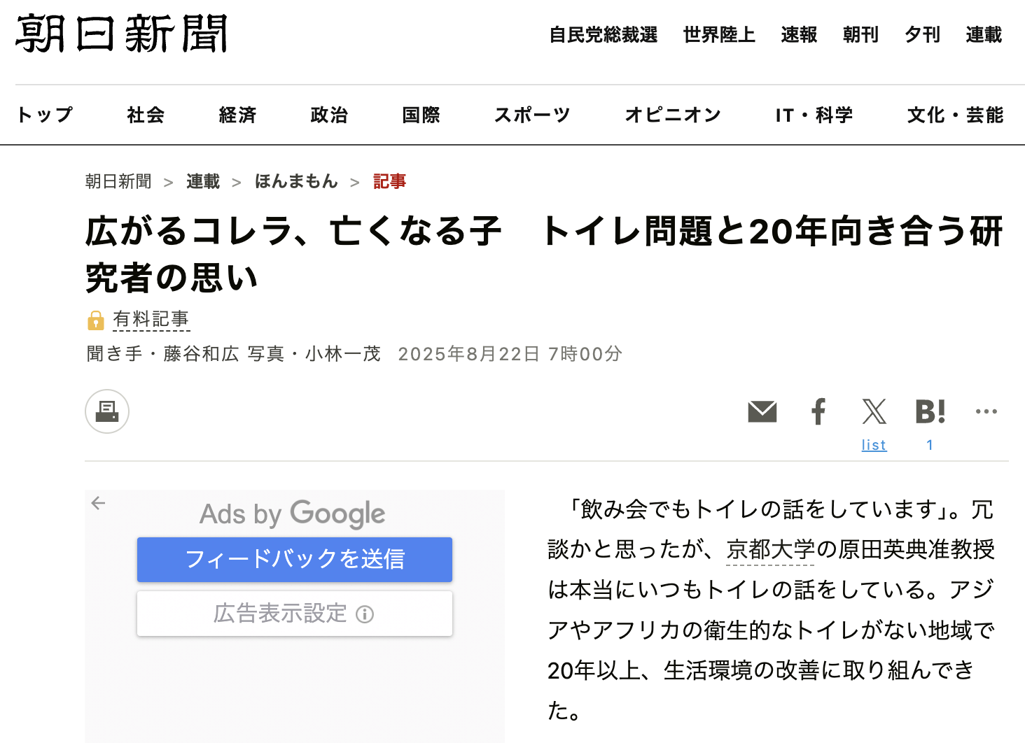 ニュース 2025年9月22日 原田英典准教授のこれまでの研究活動が朝日新聞の連載「ほんまもん」に掲載されました(2025年8月26日朝刊(関西版18面)および8月22日オンライン版。これまでの研究の軌跡とあわせ,なぜアジア・アフリカのトイレ問題,水・衛生を研究し続けているのか,研究者としての思いが記事になっています。広がるコレラ、亡くなる子 トイレ問題と20年向き合う研究者の思い Water Research誌に論文が掲載されました。